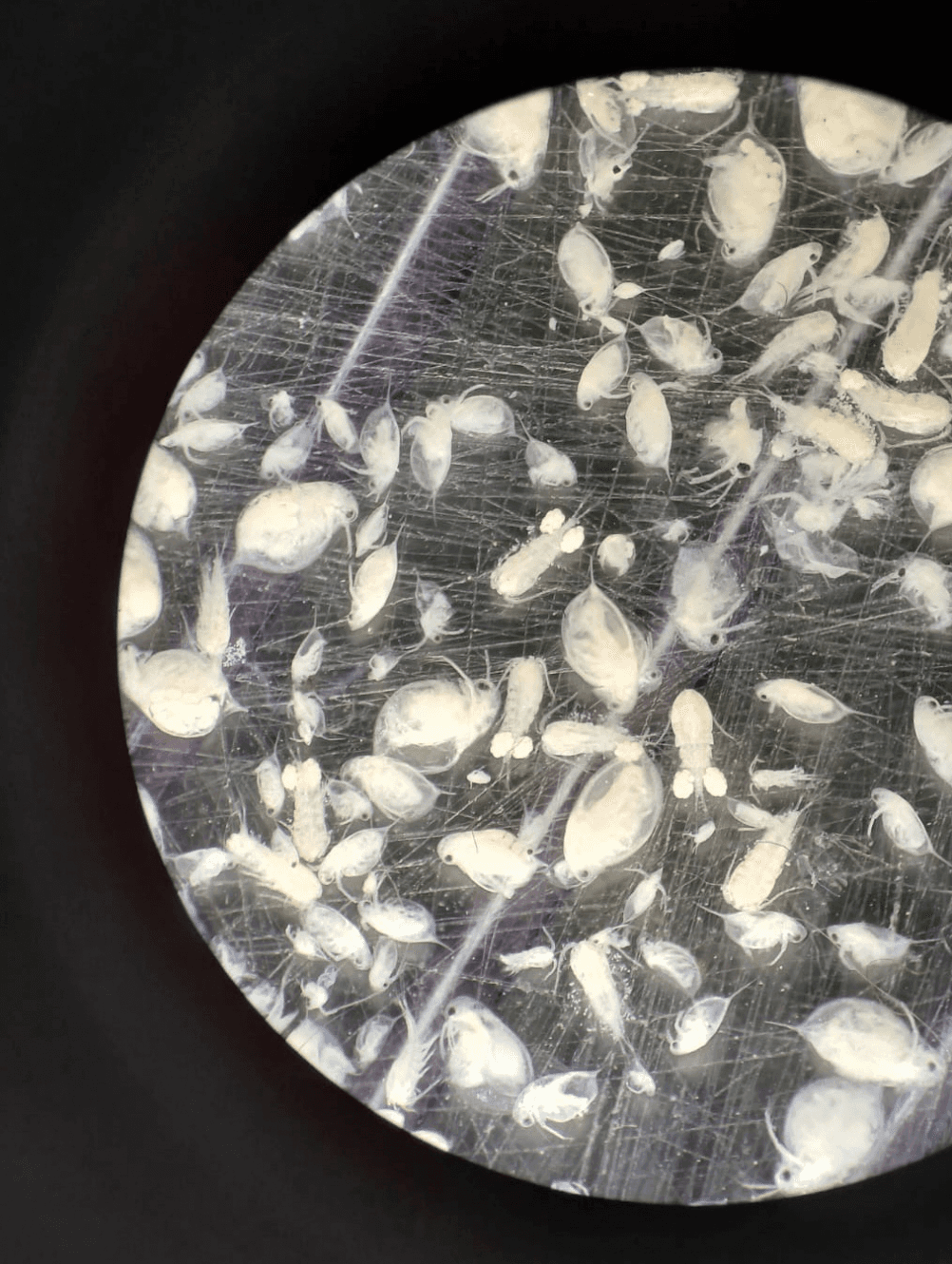 • „Purici de apă” precum speciile de Daphnia și alte microcrustacee – figura 3, care efectuează mișcări asemănătoare unor “sărituri” prin picătura de apă. Aceste organisme se hrănesc cu microalge și materie organică și reprezintă una dintre principalele surse de hrană ale unor specii de pești. Prezența lor în apa lacului indică o viață biologică activă.