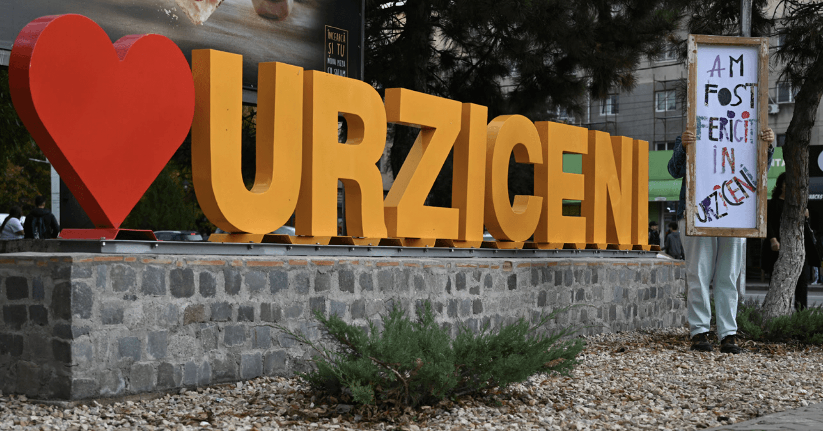 Cu câteva zile înainte, făcusem un test pe o ploaie nesfârșită, mersesem cu tabloul în gara din Urziceni și aproape căzusem la pat de tristețe după ce am vorbit cu un bărbat care cunoștea suspect de multe informații despre oamenii celebri din Urziceni și nu reușisem să îi dau poezia scrisă pe loc unei femei alcoolice pe care o bănuiam că pierduse pe cineva. Înfiorată că nu voi putea duce la capăt performance-ul din cauza propriei biografii, m-am odihnit și am luat-o de la capăt. Duminică la prânz am ratat lumea care ieșea de la biserică. Deși am fugit înaintea lor, s-au împrăștiat rapid și am discutat cu cei care erau prin parcul central, păzit de marea inimă roșie de lângă numele orașului.